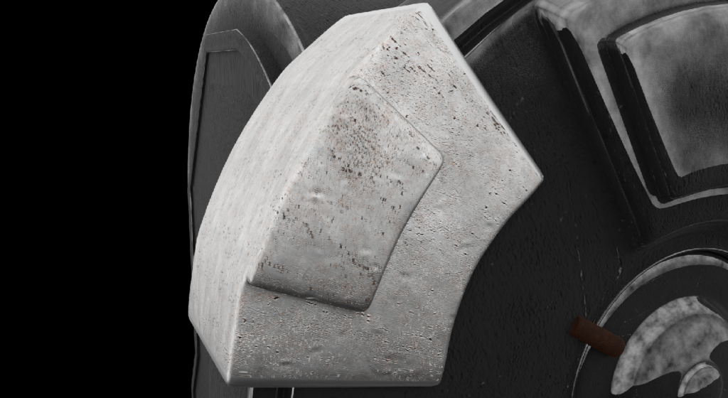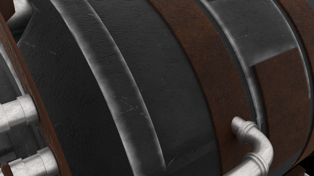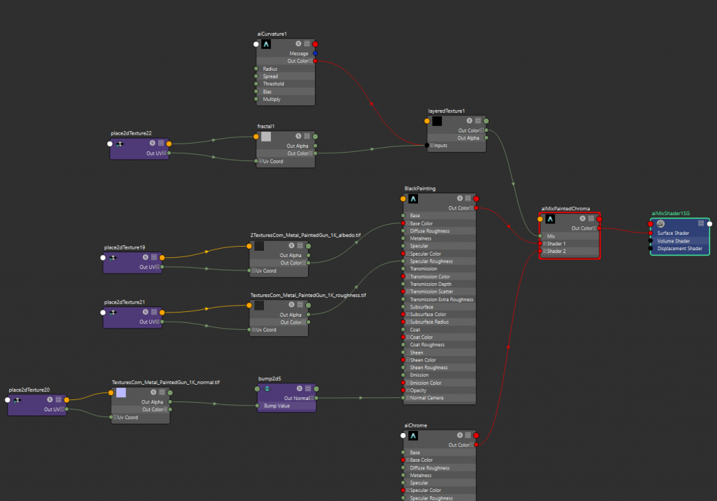 For the main parts of the engine I used a texture that was a metal painted in black, and make it look like the paint was faded in the borders. To do this I used two different textures and mixed them applying the aiCurvature node, in order to apply on texture on top of the other, just leaving the borders showing the one that’s on the bottom.